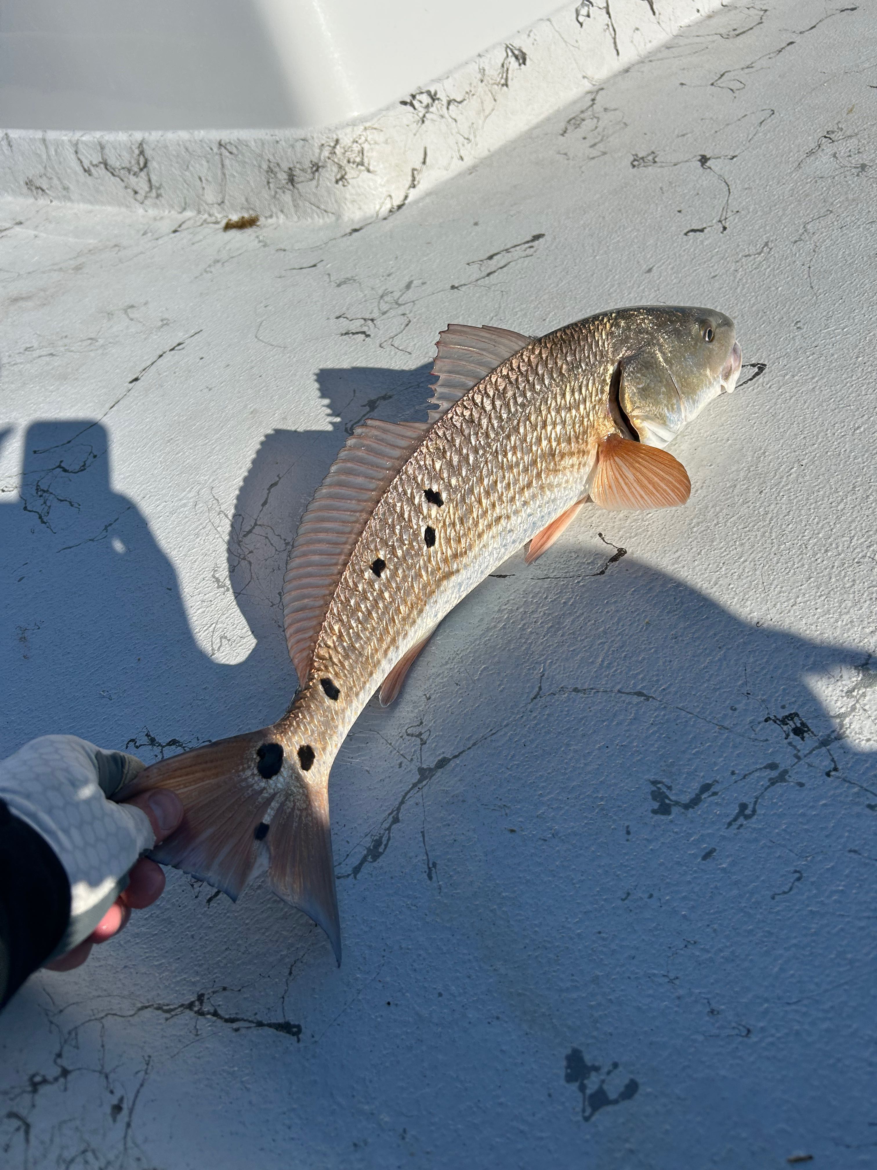 Group of three guys wade‐fishing today. With super low tides and high pressure, the trout bite was a little tough, but the reds were everywhere. We finished the day with a full three‐man limit of redfish, with plenty more released.